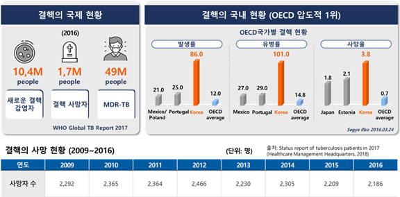 결핵은 인류 역사상 가장 많은 생명을 앗아간 감염성 질환이다. 결핵균(Mycobacterium tuberculosis)에 의한 공기매개 감염질환으로 주로 폐결핵 환자로 부터 나온 미세한 입자에 의해 직접 감염된다. 항생제가 개발되면서 발병율이 현저히 낮아졌으나 HIV 항생제 내성균의 발생 등의 이유로 다시 발병율이 증가하였고 최근에는 항암 면역치료 등의 부작용으로 결핵이 언급되고 있다. 국제적으로 매년 약1천만명의 신규 환자가 발생하고 사망자는 180만명에 이른다. 국내에서는 매년 약 3만명의 신규 결핵환자가 발생하고 약 2천명의 사망자가 발생하여 OECD 34개 회원국중 압도적 1위라는 불명예를 가지고 있다.