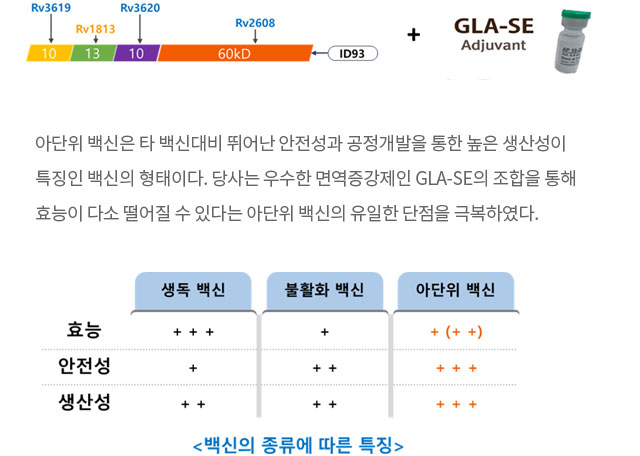 QTP101은 3개의 병독성 관련 항원(Rv3619, Rv3620, Rv2608)과 1개의 잠복결핵 관련 항원(Rv1813)으로 이루어진 Fusion protein 항원과 TLR-4를 자극하여 강력한 면역효과로 항원의 효능을 극대화 하는 면역증강제 GLA-SE가 결합되어 BCG를 boosting 하는 아단위(subunit) 백신이다.