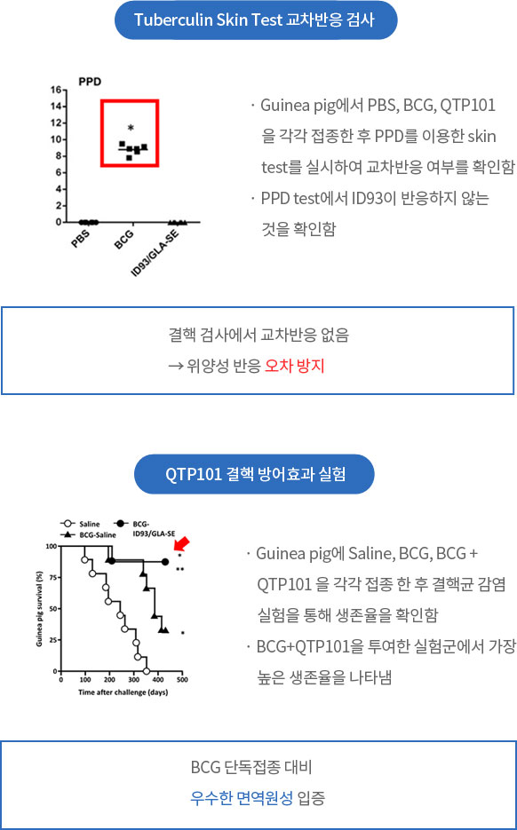 QTP101은 동물실험을 통해 결핵백신으로써의 우수성을 증명하였다. 특히 현재 가장 널리 사용되는 결핵 검사인 PPD skin test와 IGRA test에 교차반응이 나타나지 않기 때문에 위양성 판정으로 인한 검사결과의 혼선을 방지할 수 있다. 또한 기존의 BCG단독접종 대비 우수한 결핵방어효과와 장기면역원성 형성을 입증하여 차세대 결핵백신으로써의 입지를 확고이 하고 있다.