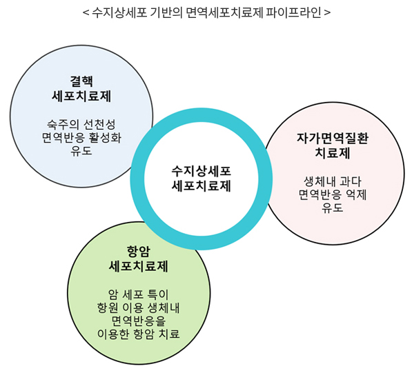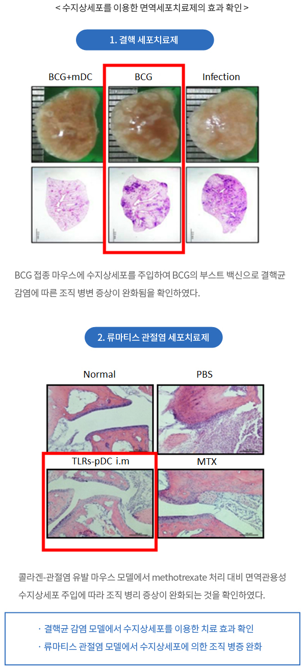 당사는 이러한 수지상세포를 이용하여 결핵균 감염 및 암 환자를 대상으로 하는 세포치료제로 개발 진행중이며 면역관용성 플라즈마 사이토이드 수지상세포 (Plasmacytoid Dendritic Cell; pDC)를 이용하여 류마티스 관절염을 대상으로 면역관용성을 증대 시킨 자가면역 세포치료제도 함께 개발 중이다.